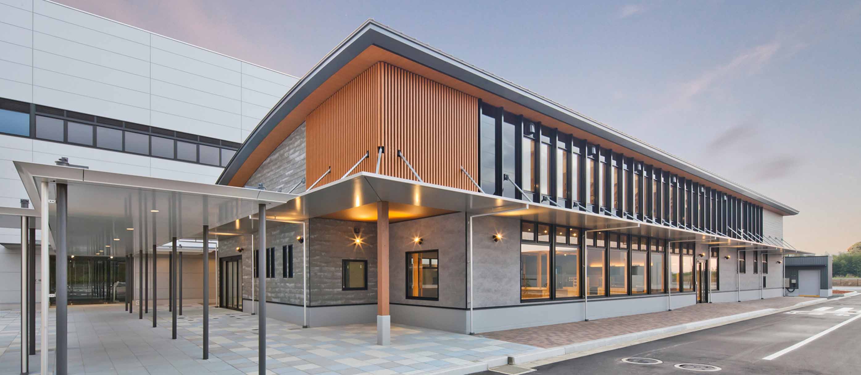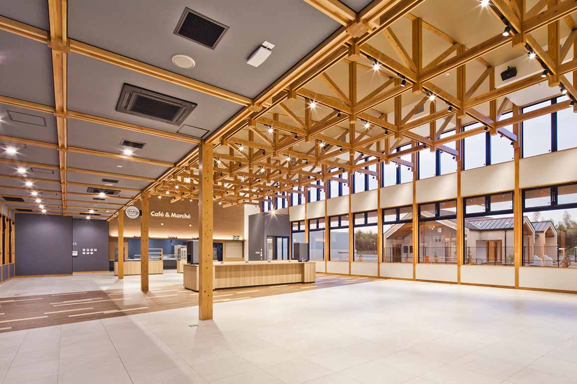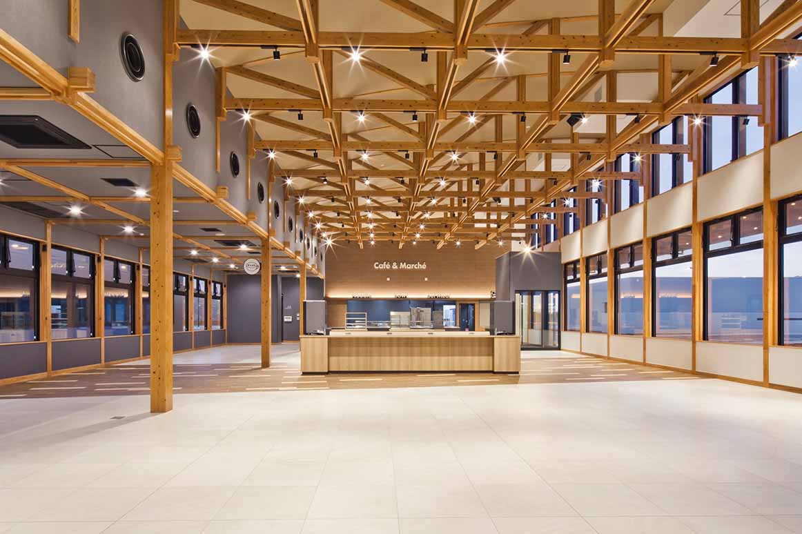 お客さまは、開発能力の向上や生産効率の追求と同様に、働きやすさや環境への配慮を大切にされている企業です。広大な工場で高品質なものづくりを担う従業員の方々が、木のあたたかみを感じられる広々とした空間でリフレッシュし、新たな挑戦を続けられる環境づくりを目指しました。
