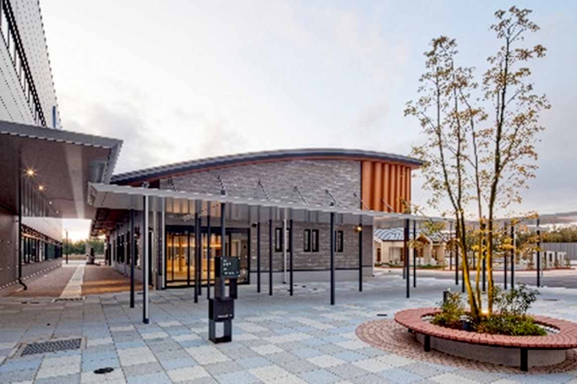 隣接する工場棟やR&D CENTERから訪れる人を優しく迎え入れるエントランス。