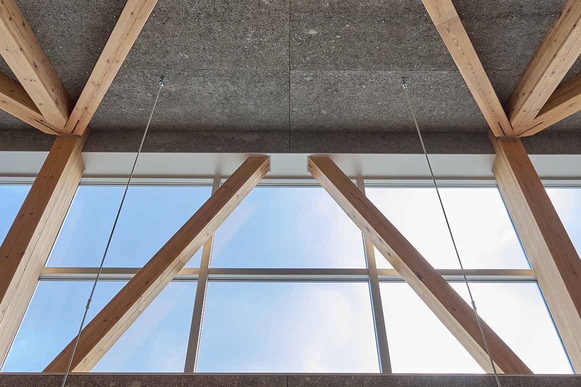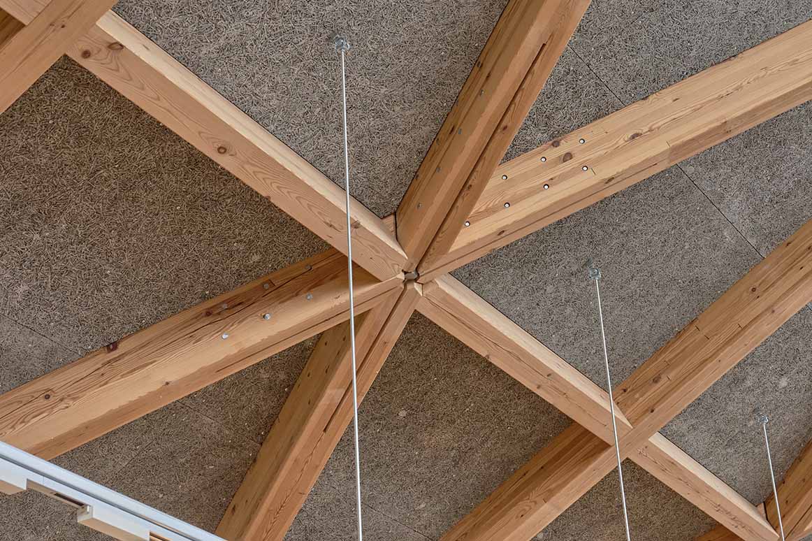ひときわ目を引く組木をモチーフにしたダイナミックな架構。