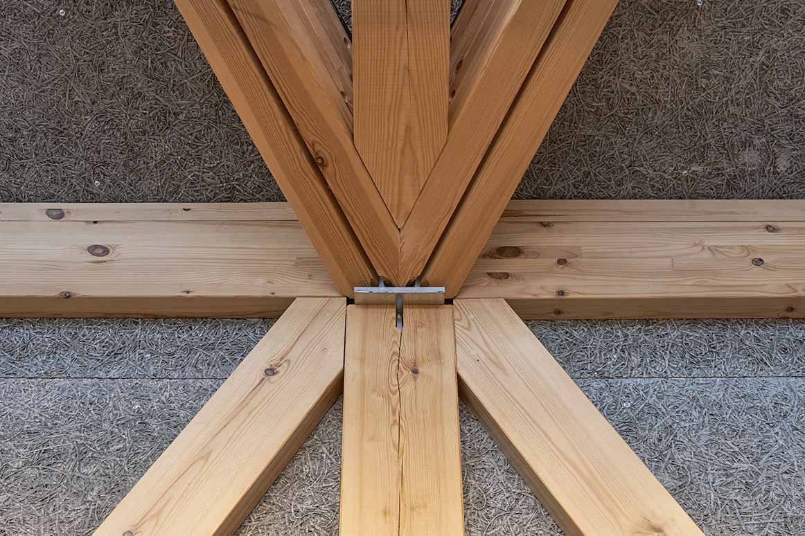 木を組んで幾何学模様を作る「組木」をモチーフにした構造体。県産材を使用しています。 -