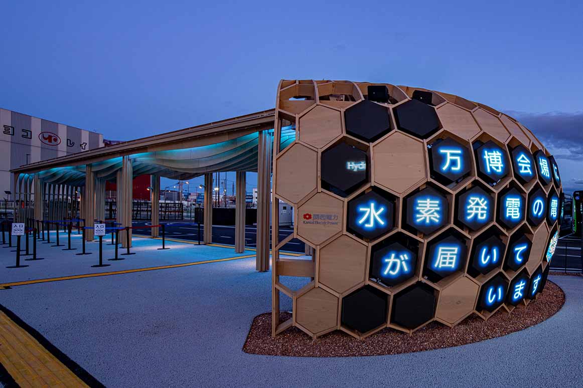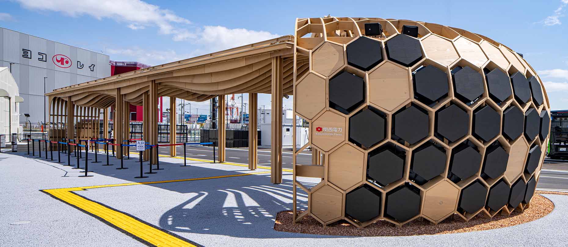 持続可能性を象徴する素材として木を積極的に活用し、波をモチーフとしたデザインで環境共生の姿勢を表現。ドーム部には映像機器を設置してカーボンニュートラルに関する情報を発信し、「EXPO 2025 グリーンビジョン」の理解促進に貢献しました。さらに軒先にドライミストを備え、待機環境の快適性にも配慮しました。