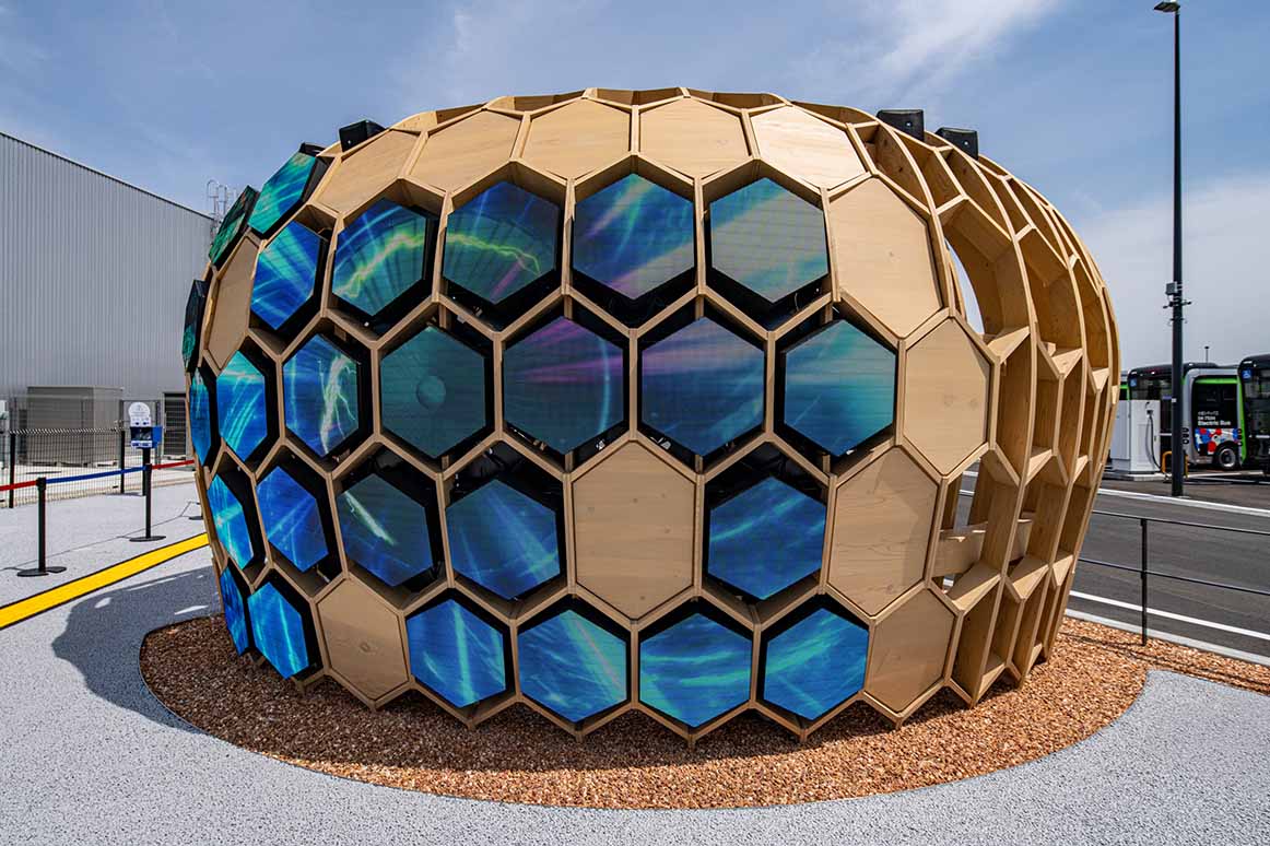 六角形のLEDや照明を埋め込み、建物と一体化。カーボンニュートラルに関する情報を視覚的に発信しています。 -