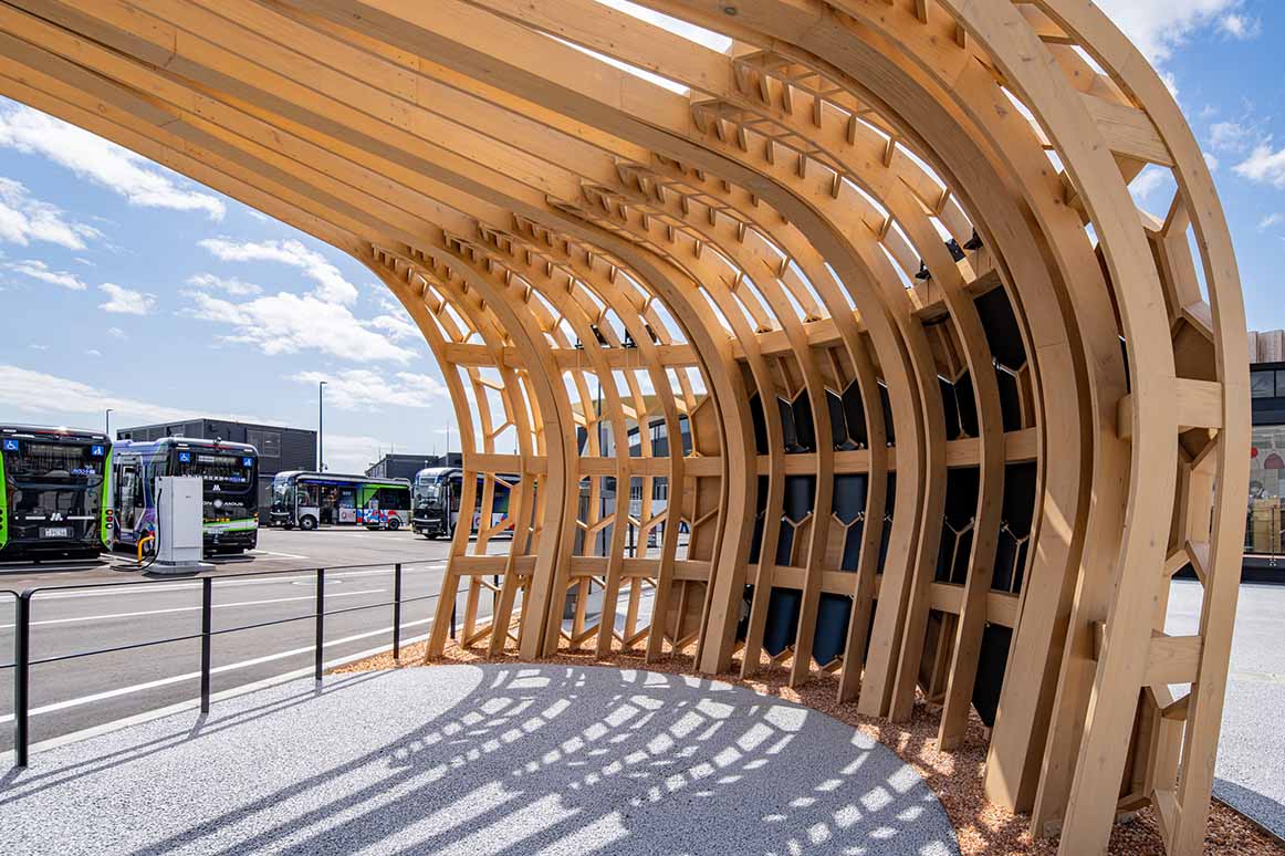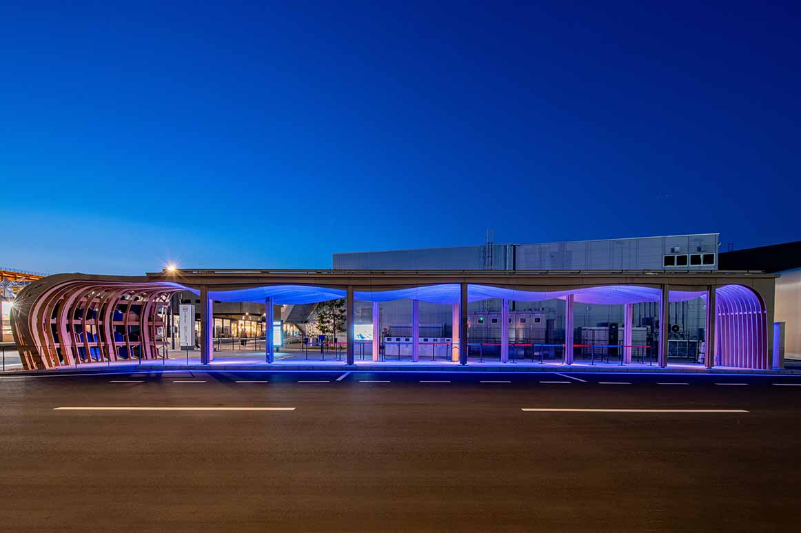 大阪・関西万博のEVバス停留所として、利用者が安全かつ快適に待機できることが不可欠でした。同時に、本施設協賛の関西電力さまによるカーボンニュートラルに関する情報発信や、「EXPO 2025 グリーンビジョン」の理解促進に寄与する役割も担っていました。