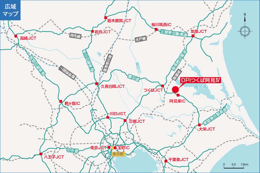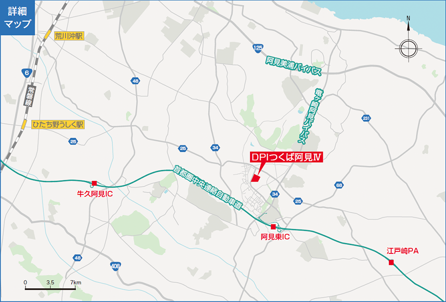 現地から圏央道(首都圏中央連絡自動車道)「阿見東IC」まで、車で約3分(約1.8km)。