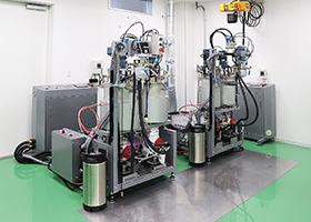 産業の発展に伴い、ディスペンサの利用分野も拡大。お客様のニーズも多様化し、生産工程での省力化やコストダウン化、多品種・少量化など、求められる機能と精度は日増しに高くなっています。特に、当社が力を入れている2液型ディスペンサは、より高精度の吐出量が求められる電子部品や電装部品の製造、航空機やロケット、スポーツ用品など、重要なCFRP(炭素繊維強化プラスチック)パーツの成型にも活用されています。