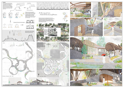 Rainy days were once joyful memories from childhood, but as we grew up, filling our lives with various responsibili-ties.Yet on the way home, as headlights approached, we could still see raindrops bursting into blossoms of water on the asphalt road.After lying vacant for an extended period, the site has evolved into a pathway connecting the north and south. With the emergence of the new studio, it is hoped that this pathway can be preserved. The greenhouse can become a daily feature. linking the small park to the north with the faculty housing to the south. (応募案より抜粋)