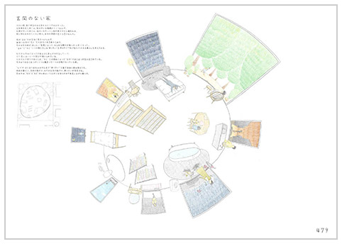 小さい頃、家に帰るのは玄関からだけではなかった。虫を捕まえた時には、祖父のいる縁側から上がり込んで、お腹が空いた時には、母のいるキッチン脇の勝手口から飛び込み、親と顔も合わせたくない時は、自分の部屋の窓から忍び込んだ。家の〈なか〉での生活に惹きつけられて、あるいは家の〈そと〉での生活に突き動かされて、その日その時の〈帰りたい〉感覚によって、あらゆる開口が家への入口になった。〈なか〉と〈そと〉ふたつの間に生じる〈帰りたい〉を滑らかに繋げる入口のある暮らしを考えてみる。住み手は、〈なか〉と〈そと〉の心地よい繋がりを自らの手で発見しながら暮らす。 (応募案より抜粋)