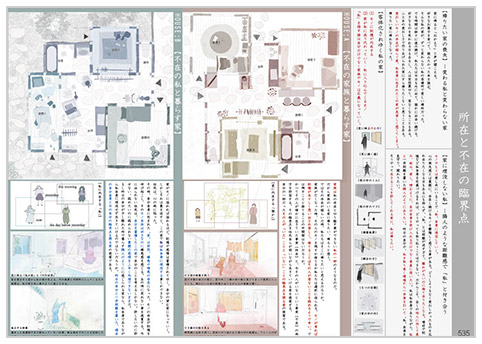 ある時には、大好きな愛犬に会いに行くところ。またある時には、キリの悪いところで終わった作業を片付けるところ。私の心や身体の状態によって、帰りたい家は変化する。ある時には、家族が騒がしく、ひとりの静けさに浸りたいと感じる自分。またある時には、家族団欒の温度の中で、複数人と共に居たいと思う自分。家の雰囲気や状態が、私のふるまいを変化させる。家の状態/私の状態の両者の関係は絶えず変化していく。この家では、〈状態〉を選べる家を提案する。そこでふたつの操作を行った。①複数の扉を設ける②複数の居場所を設ける。〈帰りたい家〉とは固定されたものではなく、家の状態と私の状態を選べる家である。(プレゼンテーションより抜粋)
