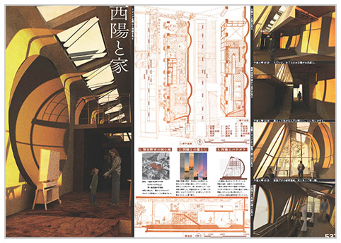 住宅に囲まれ、朝から日中にかけ日が入らず西陽がよく入る敷地である。西陽が部屋を染め、夜を迎える支度をする。嫌われがちな西陽を暮らしのリズムを生む存在として受け止め、長い夜を過ごしたくなる住宅を設計した。西陽を受けることで輝くこの家は、まっすぐに帰りたくなる家として日々の終わりにそっと寄り添う。この建物に表出するパラボラアーチは西陽を集約、拡散させる効果をもつ。一軸的な時間の流れを強調する西陽はパラボラで受けることで柱の裏までも照し、西陽しか入らない狭小地に対して、ムラのない均質な様相をつくり出している。 (応募案より抜粋)