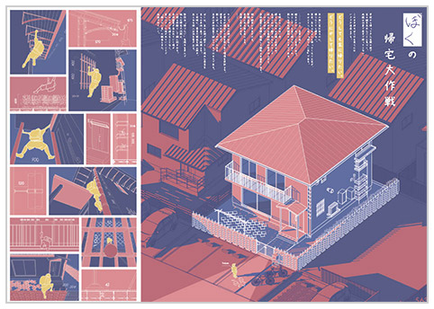 学校から帰ってきた玄関の前で家の鍵を忘れたことに気づく。両親は仕事で夜まで帰ってこない。このまま待ちぼうけを食うにはいささか退屈すぎる。どうしても家に帰りたい。どうにかして帰りたい。家の内側ではなく、外壁や外構などの家を取り巻く環境を設計する。提案するのはあくまで、散らばった「きっかけ」たちを自身の身体感覚と結び付けるプロセスである。熱烈な「帰りたい」気持ちを孕んで挑んだ帰宅大作戦は、心躍る体験として胸に刻まれる。身体感覚が養われていく場が家の「ナカ」で完結することなく、家の「ソト」にも拓かれていくことで「帰りたい家」の概念もまた、拡張されていく。 (応募案より抜粋)