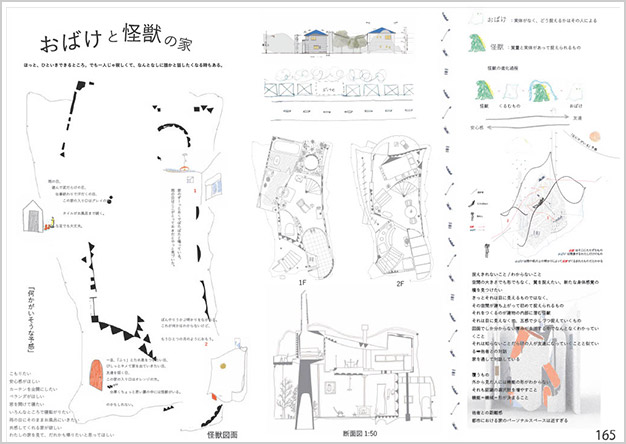僕たちは設計の起点として、純粋に心地よいと思うものから始めることにした。たとえば、こもりたい、カーテンを全開にしたい、共感してくれる家が欲しい、煙突が欲しい、青いタイルを貼りたいなどだ。しかし、これらはスケールをもつものもあれば、もたないものもあり、全体をつくっていくことは少し難しい。そこで「おばけ」と「怪獣」という言葉を使うことにした。怪獣は質量と実体があり、とらえられるもの。おばけは実体がなく、どうとらえるかはその人によるものと定義した。そしてこれらふたつを繋げるものとして、「くるむ」ということをした。怪獣は空間の背後にあるもので、おばけはこの家を介して起きるものと暮らしていく存在だ。同じ大きさ、同じ材、同じかたちの空間だとしても、その背後にいる怪獣の存在によって、そこにはきっと違うおばけができるのだと思う。こうして空間の背後にいる怪獣の存在を暮らしながら少しずつ知っていくことは、僕たちが友達をつくることと似ているのかもしれない。(プレゼンテーションより抜粋)