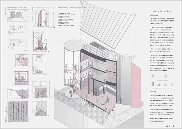 帰りたい家は、諸存在が同化し、同化されるための設えとして、〈さまざまな境界〉で構成された多層的な〈減速作用〉の空間である。〈帰る〉という営みの本質は、対象やイコンではなく、ヒトが内向的に収縮し、他者と同化するベクトルにあるのではないだろうか。発散し他者へ手を伸ばす、どこかへ行くという行為の鏡合わせに、収縮し他者と同化する、〈帰る〉という営みを見る。たとえば椅子に掛け窓の外を眺めながら、出会った物語を反芻すること。たとえば寝台で微睡みながら景色を回想し思い出へ紡ぐこと。同化する他者に応じ多層性をもつ〈帰る〉という営みを、減速という力動≒ベクトルととらえる。私たちは、家と外の境界であるドアを超えてなお、家の中の〈一様な境界(t=20mmのドア)〉を通り、さまざまな他者の同化を試みる。帰りたい家、そしてそれを構成する境界は、さまざまな他者と同化する多層的な営みのために設えられるべきである。本来、多様な表れをもつ〈境界〉が構成する、減速作用の家=帰りたい家を提案する。(プレゼンテーションより抜粋)