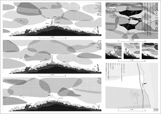 ガスってしまった。風はない。ギリギリ見える水の粒が空中浮遊していて、大きな塊となって私を包む。視界のほとんどを埋める白の奥に、確かな岩の輪郭を見て、手を伸ばす。遠くで転がる石、そよ風で揺れる松葉、鼓動で揺れる私の重心。感覚がガスに溶けていく。見えない基準に私を当てはめる。本計画は、森林限界を越えた山岳地帯を対象に段階的に形成される山岳避難小屋を提案する。求められる性能は、悪天候下での高い視認性、厳しい環境での強度と、そして必要最小限の人が滞在できる設備である。山はガスや雪、雨、人の足跡などによって条件が一定とならない。故に事前にすべてを設計することは現実的ではない。本計画では、第1段階として簡易的な拠点を設けることとする。山は見えきらない。当たり前な地面はない。微かな頼りを自らの身体で補完する。山道を10km歩く中で、1cmの岩の突起に安心して指を掛ける。ガス、ガス、ガス。溶けた五感に誰か見える。来年も歩く私に必要なあの形状は確かに私の基点のひとつだ。(プレゼンテーションより抜粋)