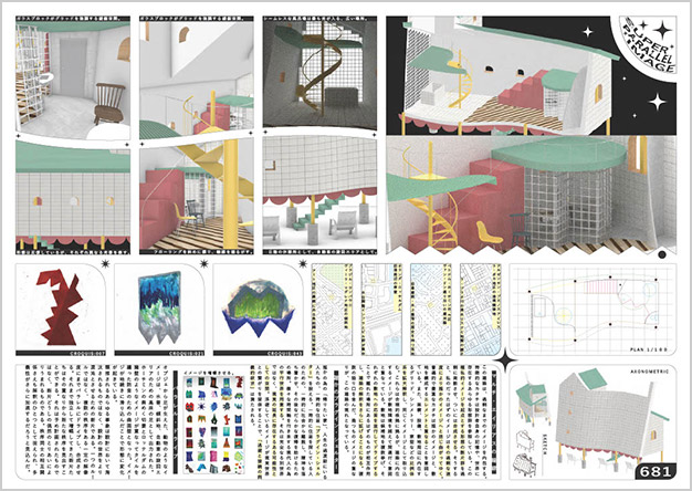 特徴的なカタチは設計者自身の記憶や、世界に存在するあらゆる形態群を参照している。この極私的イメージを起点とする形態の断片群を過剰に発散させ、ついには合成させる。そうすると、私のだったはずのイメージはその過剰な速度により誰かのイメージへと捻じ曲がってゆく。また、架構、設備、敷地周辺に内在するグリッド、シンメトリー、家型などの比例体系を拡大解釈し、同じくイメージとして取り込む。敷地は複数挙げ、それぞれへの応答を並行してドライブすることで離れた場所にあるはずのものが相互作用し、建築の解釈をさらに拡げることになる。複数の語り口を含んだ、いくつものイメージの重なりが、この建築の現れとなっている。(プレゼンテーションより抜粋)