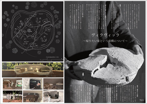ヴィラヴィッラは郊外にある森林の中に建つ別荘である。この家には現在、4世帯が暮らしている。集まって住むかたちはそれぞれで住む人たちも変わる。時間の経過により人びとの認識は変わってもヴィラヴィッラはそこに存在し続けるだろう。私たち4人は「帰りたい家」という虚構をつくるために案を出し合った。すると、私たちは無意識のうちに「帰りたい家」を住宅の原空間と認識していた。私たちが考えた原空間(帰りたい家)は虚構だ。しかしながら住宅は実体である。柱があり壁があり屋根があり、そしてその屋根の下で私たちは生きている。だから私たちは「帰りたい家」という虚構を、生きるための家へ、つまり実体にすることに注力した。 (プレゼンテーションより抜粋)