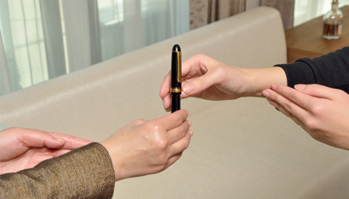「物を渡すときも受けるときも、両手を使ってていねいに。そのしぐさで、相手を思う心が伝わります。片手でも持つことのできる小さな物には、もう片方の手を軽く添えましょう。ペンなど今すぐに使う物は、相手の方の手に収まる角度に傾けてお渡しします」
