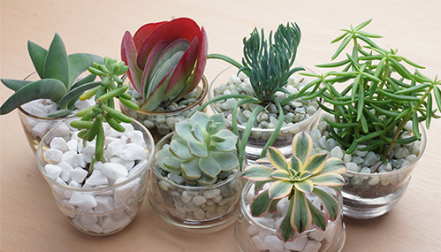 おすすめは、ふっくらとした姿がユニークで、お手入れが簡単な多肉植物。フォルムが個性的なので、大きさは同じくらいに揃えるのがポイントです。それぞれの表情を生かしながら、全体をしっくりとバランスよくまとめることができます。