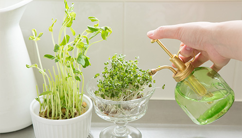 イエナカ菜園で注意するポイントは、水やりです。コットンに種をまいた場合は、発芽するまで暗い場所に置くかカバーをかけておきますが、その間も、コットンが干からびない程度に水をあげることをお忘れなく。根から育てる野菜の場合は、水に浸る部分が多すぎると腐ってしまう可能性があるので、スプレーで水を吹きかける程度で十分です。