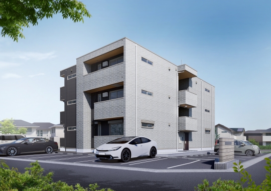 外壁をグレーの一色で計画し、ファザードはシャープな印象を演出するとともに、両端に袖壁を立ててバルコニーを目隠しすることで、生活感のない洗練された印象を与えます。また、館銘板からエントランス、エントランスから駐輪場へと化粧舗装をすることで動線を確保しています。