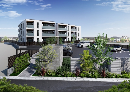 当社商品「TORISIA」の会場になります。屋内廊下タイプのホテルライク仕様、外観デザインにもこだわりました。エレベーター付き、Nearly ZEH-M仕様になっており、ご入居者に快適な住まいを提供致します。