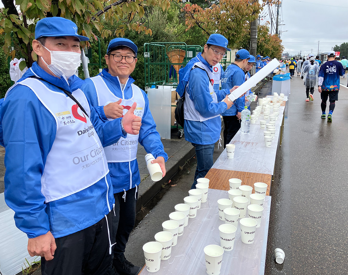 当日は、ランナーの皆さまへ水分補給のサポートを行いながら、完走を目指す一人ひとりに心を込めて声援を送りました。あいにくの雨の中、ランナーたちが懸命に走る姿に触れ、参加した社員も地域の一員として支える喜びを改めて感じる一日となりました。