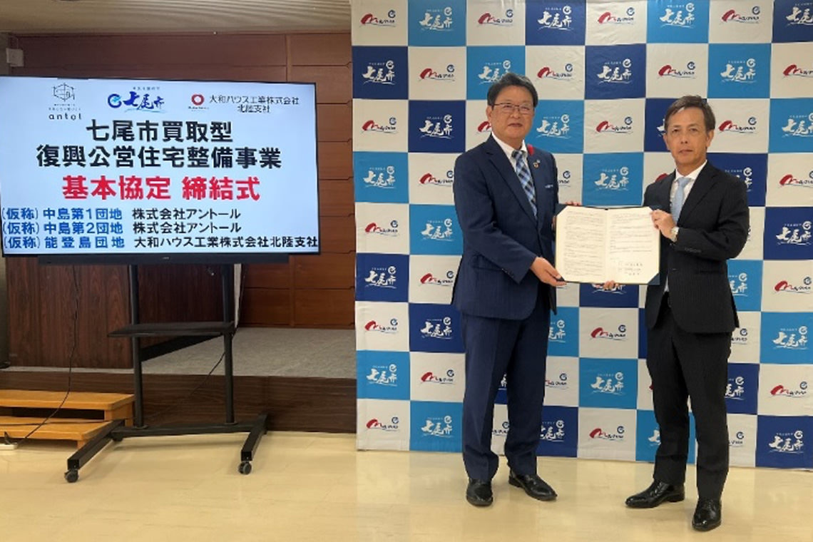 2025年10月9日、石川県七尾市は能登半島地震で被災した住民向けの復興公営住宅整備事業について、当社と基本協定を締結しました。今回の協定は、市が民間事業者に建設を委託し、完成後に買い取る「民間買い取り方式」を採用することで、早期の住宅供給を目指すものです。