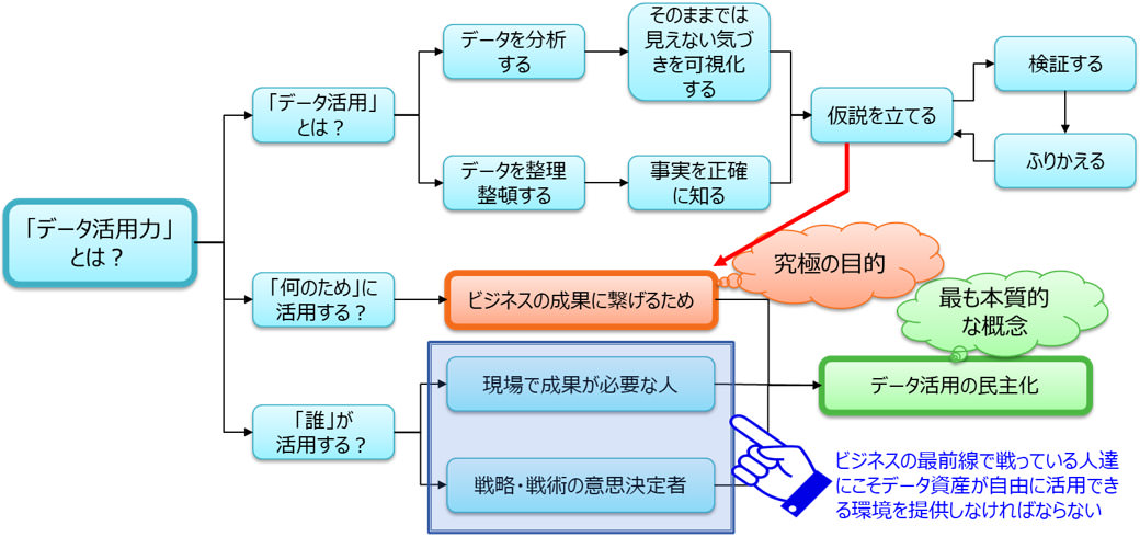 データ活用の目的はビジネス貢献です。ビジネスへの貢献を最大化するためには、事業活動の最前線である現場においてどれだけデータ活用が浸透しているかがポイントとなります。重要なのは高度なデータ分析スキルやIT専門要員しか扱えないデータ基盤ではありません。現場を中心に幅広くデータリテラシーを習得し、最前線でデータを武器として戦える装備を整え、データを必要とする人が、必要なデータを必要な時に、安全に利用できる環境を実現することこそ、データ活用によるビジネス貢献につながると考えています。