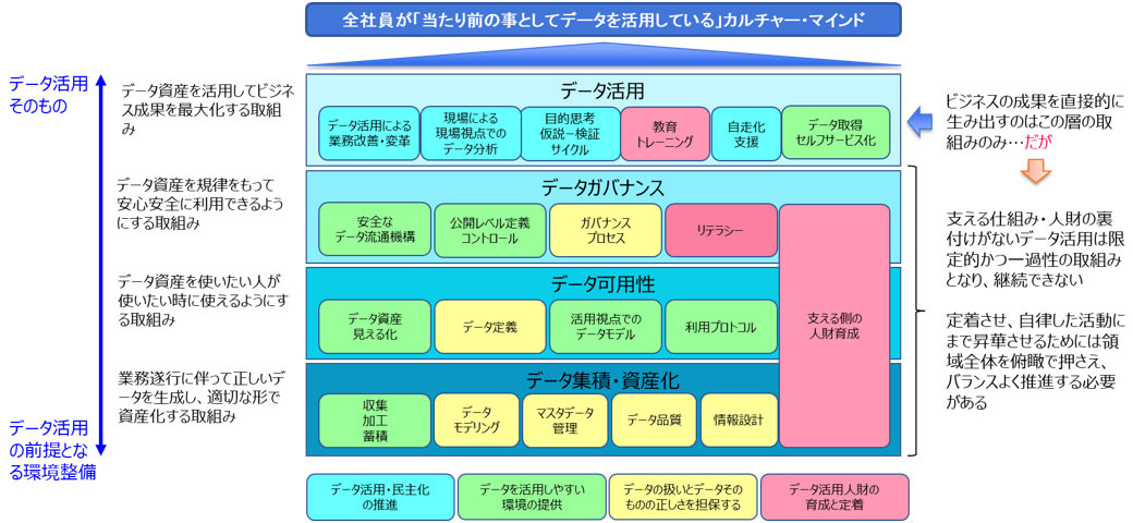 日常的に現場でデータが活用される状態は、現場のデータ活用力を向上させる施策だけでは実現できません。必要な時に必要なデータが利用できる、安心安全に利用できるという前提が必要ですし、そもそもデータが集積され利用可能なデータ資産として整理されていなければなりません。
