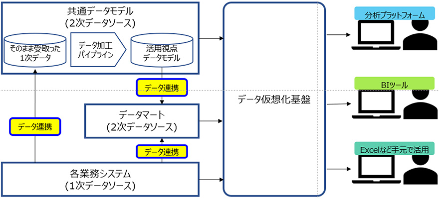 現場でのデータ活用を促進する上での大きな阻害要因の一つがデータ取得の煩雑さです。現状では活用したいデータを入手するためには必ずデジタル戦略部担当者へのデータ取得依頼を申請する必要があり、取得したいデータの内容によっては依頼をしてから申請者の手元にデータが届くまで時間を要するケースもあります。現場でデータを活用したい人が、活用したいデータを、活用したい時に入手できる環境の実現を目指してデータ仮想化基盤を中心としたセルフサービス化の仕組みを導入しました。今後はセルフサービスの対象となるデータを段階的に拡充し、データ活用の裾野を広げていく取り組みを後押しします。