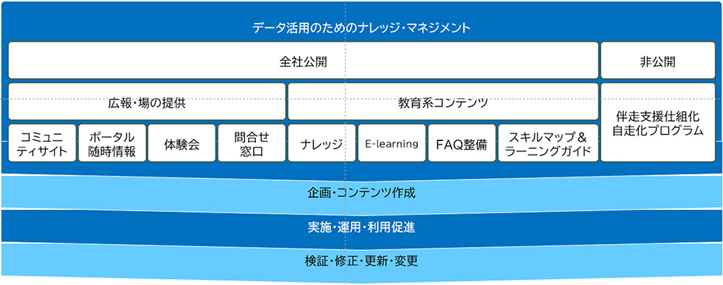これまで行ってきた伴走支援活動から得られたノウハウや、現場での取り組み結果を社内事例として積極的に発信していくことで、問題意識を持っている現場の社員にデータ活用を考えてみるきっかけを提供しています。ナレッジポータルからの発信だけでなく、社内事例を題材に実践レベルのeラーニングを公開したり、未経験者に体験会の場を設定するなど「知る機会」を意図的に創りこんでいくことでデータ活用に興味を持ち、取り組み始めた現場が目に見えて増加傾向にあります。