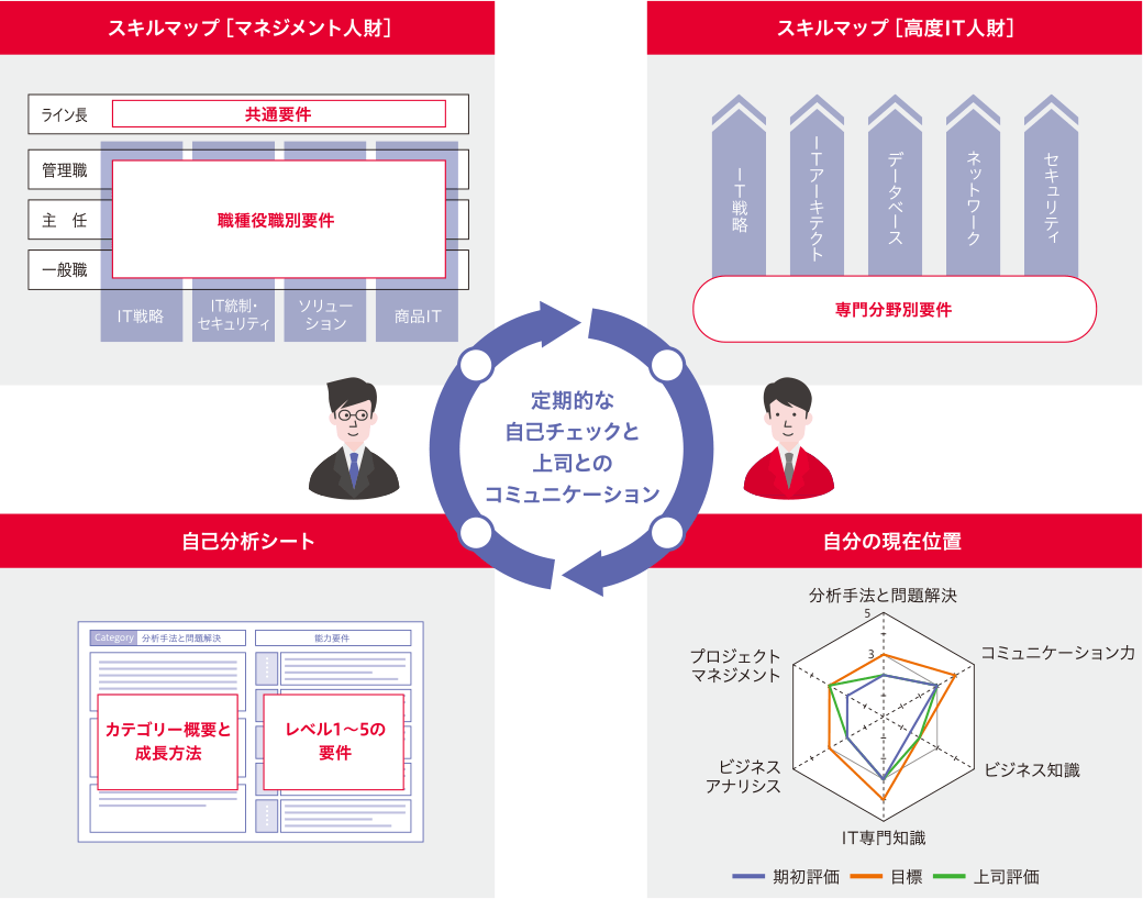 ガイドラインにおいては、マネジメント人財と高度IT人財のそれぞれに求められる能力をスキルマップとして明確化しました。そして、自己分析シートを活用して自分の現在位置を定期的に確認し、今後の成長・育成について上司とコミュニケーションをとっています。(図1)