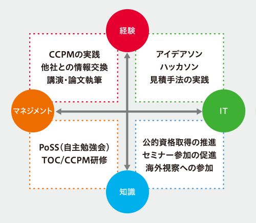 デジタル戦略部門では、ゼネラリストとしてのマネジメント人財と、スペシャリストとしての高度IT人財の両方が必要です。マネジメント人財として能力の幅と深さをバランスよく成長させるか、高度IT人財として技術に特化して成長させるか、個人個人の資質に合わせて育成します。育成にあたっては、座学だけでなく実践する場を与えることを重視して進めています。