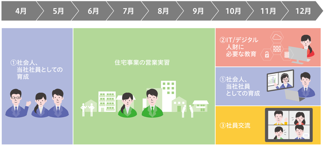 基礎教育としての「①社会人、当社社員としての教育」。これからのIT/デジタル人財に必要とされるスキルを再定義した専門教育としての「②IT/デジタル人財に必要な教育」。テレワークにおいても社員間のコミュニケーション量を増やし、多くの先輩社員から価値観や仕事に対する姿勢を生の声から吸収するための「③社員交流」。以上、3つのカテゴリと全社的に実施される「住宅事業の営業実習」を加えて新入社員教育を実施しています。これらの各種教育は、教育を実施する側と受けた側のフィードバックを随時行っており、毎年継続的な改善につなげられるよう運用しています。(図3)