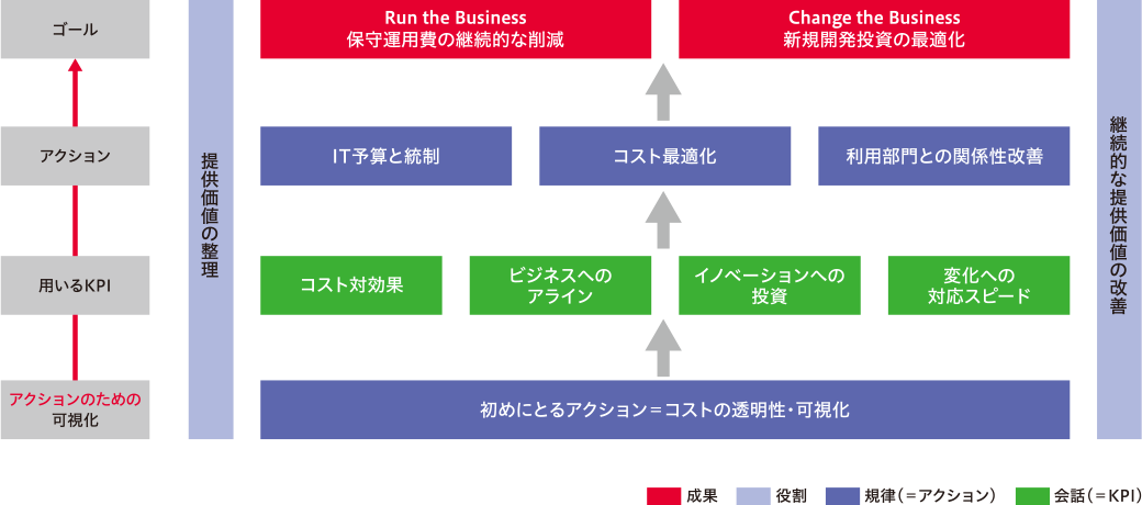 分析したデータをもとに「ITコスト最適化」「利用部門との関係性改善」「IT予算と統制」を実施します。ITコスト最適化では、無駄なコストを削減し、効率的なIT投資を行うための具体的な改善策を施します。利用部門との関係性改善では、データに基づいた説明を行い、部門間での理解と協力を促進します。IT予算と統制では、予算管理を強化し、最適なIT投資を目指します。