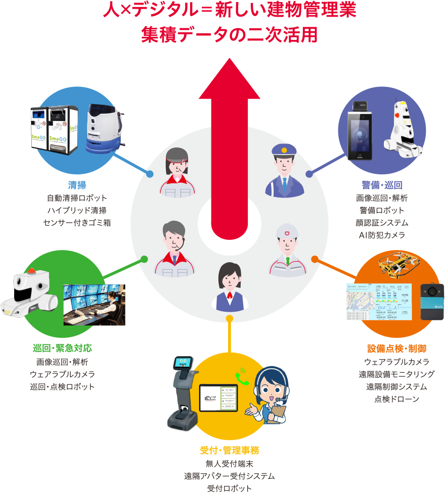 当社グループは省力・省人からさらに一歩進んで、各種IoT機器から得られるデータを集積・分析し、管理業務の数値化・見える化を図ることで、お客さまにも透明性と付加価値の高い管理業務を提供していきます。