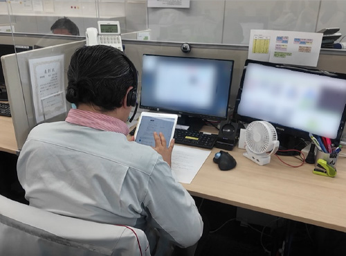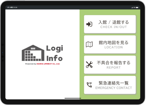 物流倉庫においてタブレット端末で現地スタッフとの通話から館内資料閲覧、入退館管理などをペーパーレスでスマートに行うことができる受付アプリを内製開発しました。