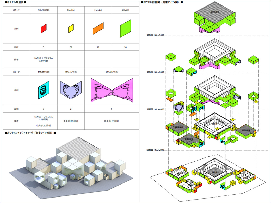 本建築物の必要な建築空間は展示棟で15.5m×15.5m、事務棟・警備棟・休憩棟の3棟は7.6m×7.6mの至って整形な形状です。一方で、構造物の外形は建築空間を形成する整形な箱形状の外側に、展示棟では2m~8m立方(一部はデザインアイコンとして立方体の面や角が解け落ちたような曲面形状)のボクセル、事務棟・警備棟・休憩棟では同じく2m~4m立方のボクセルがランダムに取り付いた複雑な形状となっています。
