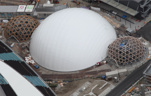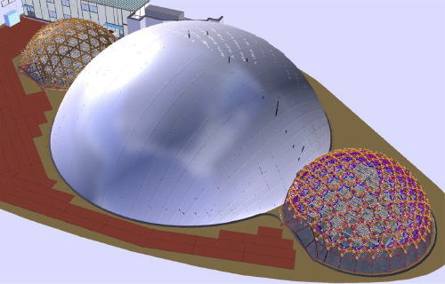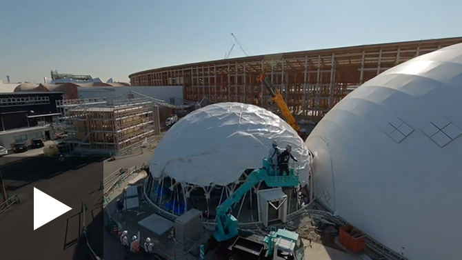 ブルーオーシャン・ドーム新築工事は、球体構造(写真1)を持つパビリオンであり、従来の建物とは一線を画す建築物であるため、技術的挑戦が求められました。