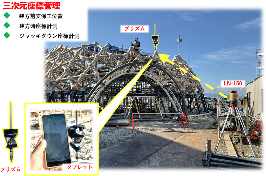 さらに、LN-150で取得した座標データは、eYACHO(電子施工管理ツール)(図4)を通じてリアルタイムで共有され、施工精度の確認や現場全体の情報連携を強化。建方完了後のジャッキダウンにも活用されました。