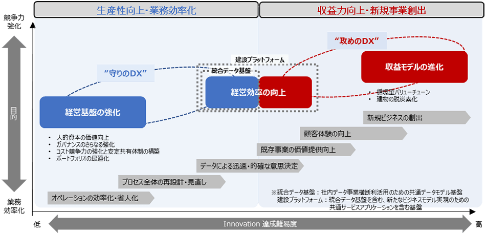 当社では、持続的に成長可能な企業を目指したビジネスモデル変革に向けて、収益力向上や新規事業創出につながる取り組み(「攻めのDX」)と2024年建設業の残業規制の対応や各事業領域の成長課題から生産性向上や業務効率化といった経営基盤の強化(「守りのDX」)との両立を目指しています。