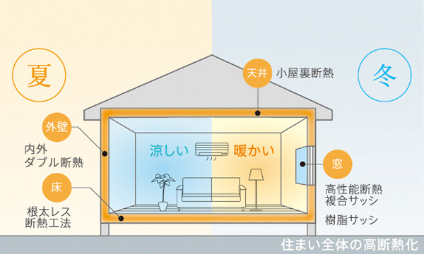 外気温の影響を抑え、夏は涼しく冬は暖かく、冷暖房費の大幅な削減も期待できる住環境を支えます。