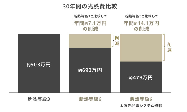 ※試算条件:当社光熱費算出ツール「eco ナビゲーター」にて試算。試算条件および時期により異なる。【共通】建設地域:東京/延床面積 97.88m2/空調エアコン/調理機器ガスコンロ【断熱等級3の家】UA 値1.54 ηAc3.8/太陽光発電なし/給湯ガス給湯器/1・2階 天井高 2400mm 【断熱等級 6 の家】外皮平均熱貫流率UA値0.44 ηAc 1.2/太陽光発電搭載 4.104kW/給湯高効率ガス給湯器/1階天井高2720mm・2階 天井高2400mm /売電価格1~4年24円、5~30年8.3円と仮定して試算。