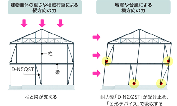 独自の耐力壁により、地震エネルギーを効果的に吸収することで、壁や柱が少ない高天井の大空間でも、繰り返す巨大地震を耐え抜くことができます。