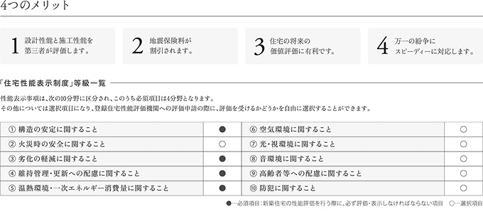 今まで住宅メーカーなどがそれぞれ独自に表示していた住宅の性能を、第三者である「登録住宅性能評価機関」が共通の基準で評価する任意の制度(有料)です。住まいの安全・安心の判断指針としてご活用いただくことをおすすめします。