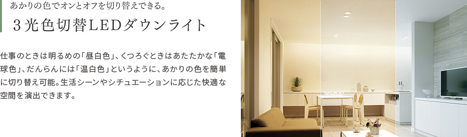 仕事のときは明るめの「昼白色」、くつろぐときはあたたかな「電球色」、だんらんには「温白色」というように、あかりの色を簡単に切り替え可能。生活シーンやシチュエーションに応じた快適な空間を演出できます。