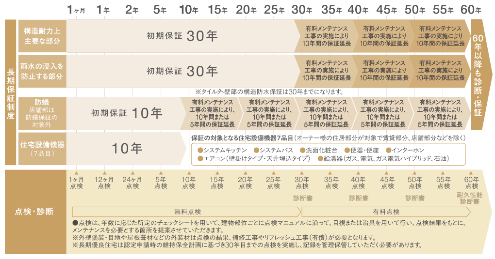 - 1.「構造耐力上主要な部分」および「雨水の浸入を防止する部分」の初期保証期間は、保証期間内に当社が実施する点検を受けられることを条件に、お引渡しの日から30 年間(RC 造は10 年間)となります。点検を受けられなかった場合、原則としてそのときから保証が受けられなくなることをご承知おきください。