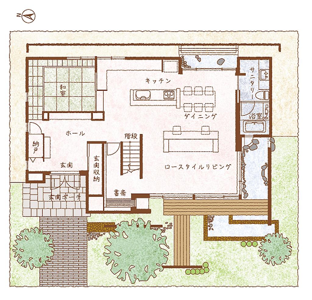 間接照明とぽっかり浮かんだ月のような金箔張の円窓と、ゆったりと足を伸ばせる掘りごたつがくつろぎの和室を作り出し、また、2階には、多目的にご利用いただける大型の軒下バルコニーがございます。