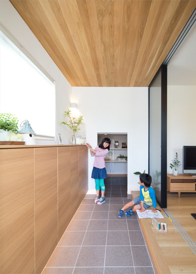 リビングとつながる玄関には大容量の収納を設置。奥には自転車やアウトドア用品を収納できるスペースも備えているので、スッキリと見せることができます。無垢のオーク材をあしらった化粧天井とし、帰宅するとほっと心が和む空間を演出