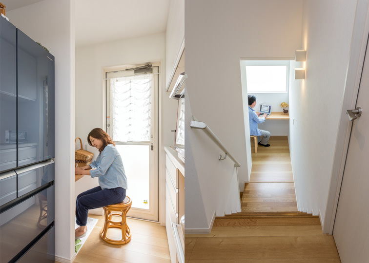 カウンターを設けて家事室も兼ねたパントリーや、中間階を書斎コーナーとするなど、夫妻それぞれに上手く希望の空間を実現。いずれも家族とのつながりを保ちながら、プライベートな時間を過ごせる大切な空間となりました