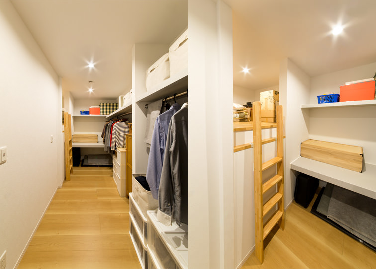 2階に配した大容量のクローゼットは小屋裏収納も備えて機能的に